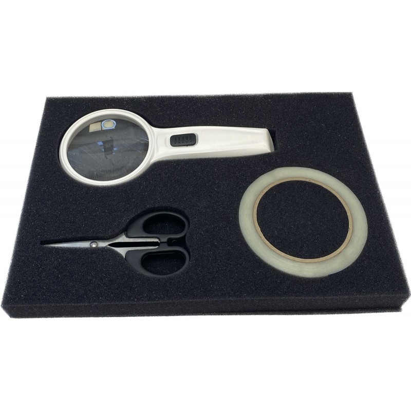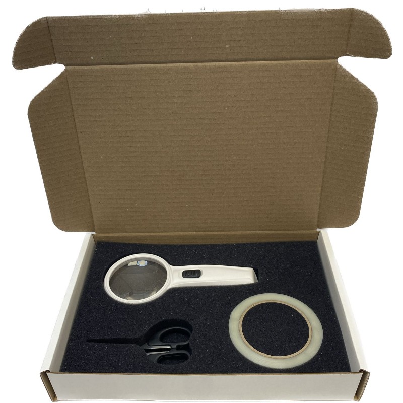 Линза увеличительной лупы выполнена из оптического полимера, что не приводит ее к помутнению в процессе пользования набором. Один комплект батарей рассчитан на использование подсветки в течении 30 часов непрерывного свечения (в зависимости от типа батарей).