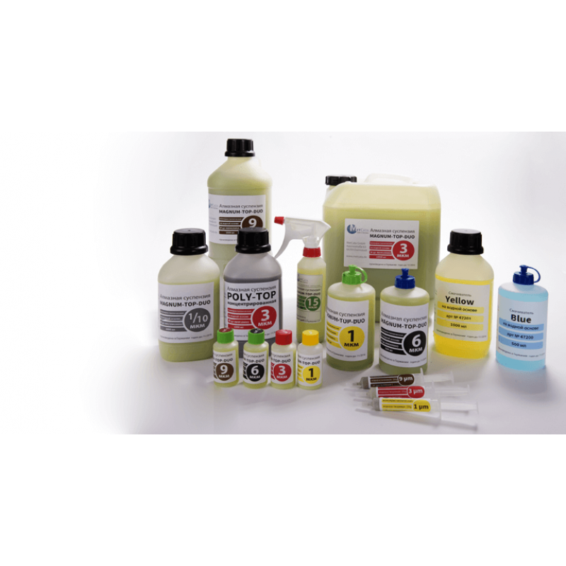 Монокристаллические алмазные суспензии на водной основе Magnum-Top-Duo (два в одном) с добавлением охлаждающего лубриканта. Монокристаллы имеют меньшее количество режущих краев, а их форма напоминает куб, поэтому идеально подходят для рутинной работы и обработки материалов различной твердости. Суспензии Magnum-Top-Duo можно использовать в дозирующих устройствах для автоматической подачи в зону полировки шлифовально-полировального станка, а также возможно применение самого обычного распылителя. Суспензии Magnum-Top-Duo экологически безопасны и полностью биоразлагаемы.